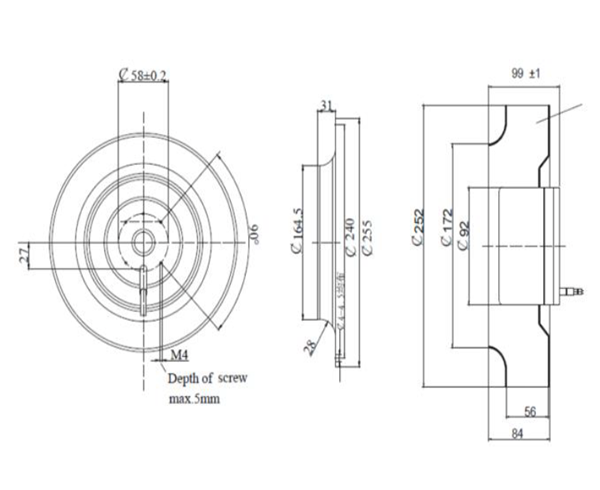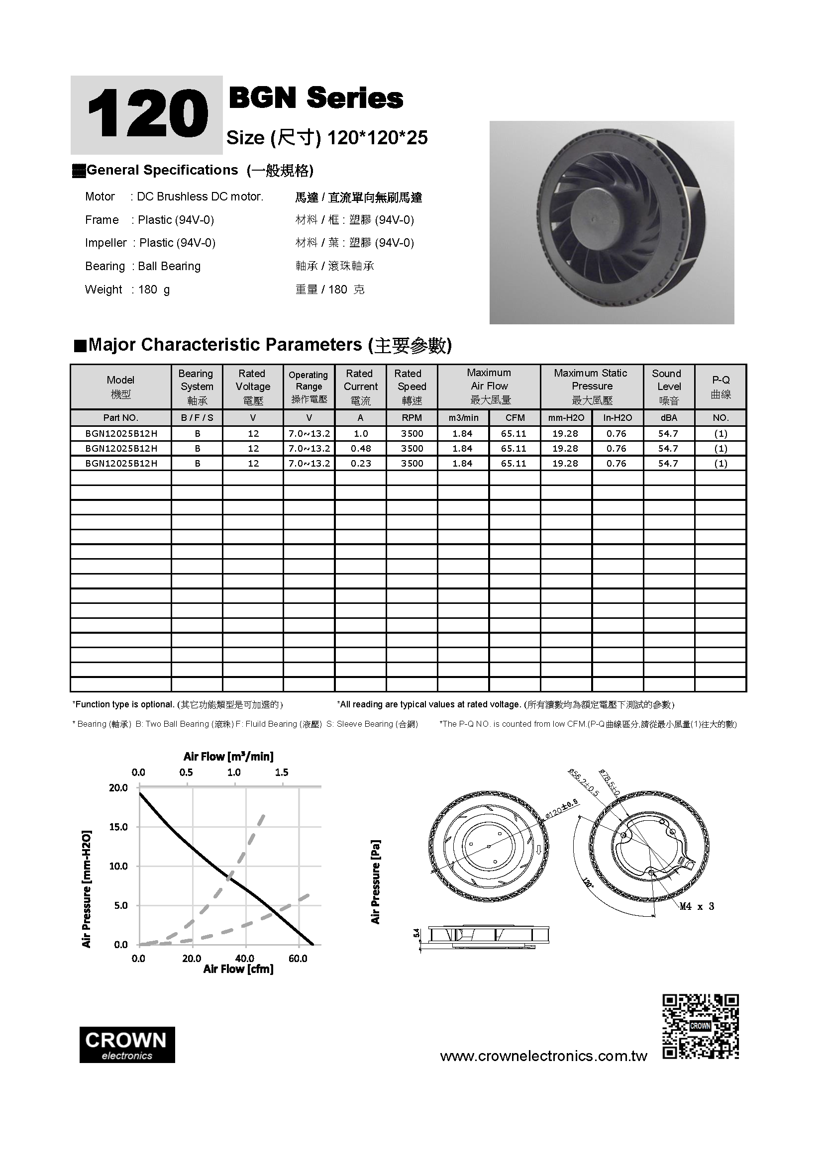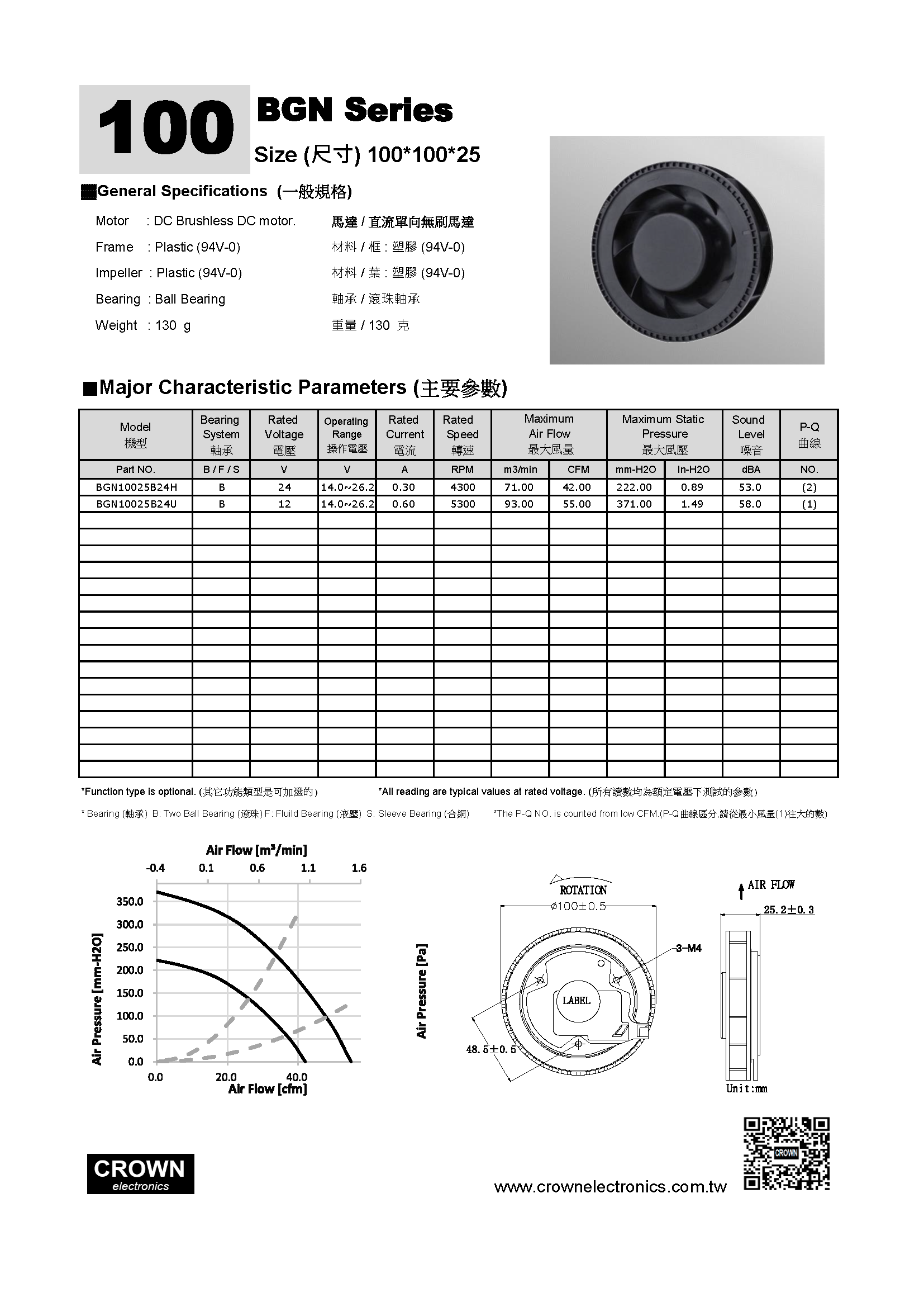 | 額定電壓 | 頻率 | 輸入功率 | 參考轉速 | 最大風量 | 最大風壓 | 噪音 | Model No | VAC | Range(V) | Current | RPM | CFM | m3/min | Inch/H2O | mm-H2O | db(A) | BGN25099B24U | 24 | 14.0~26.2 | 5.7 | 2750 | 877.54 | 24.85 | 2.37 | 60.1 | 75.0 | BGN25099B48U | 48 | 28~56 | 3.0 | 2750 | 877.54 | 24.85 | 2.37 | 60.1 | 75.0 |