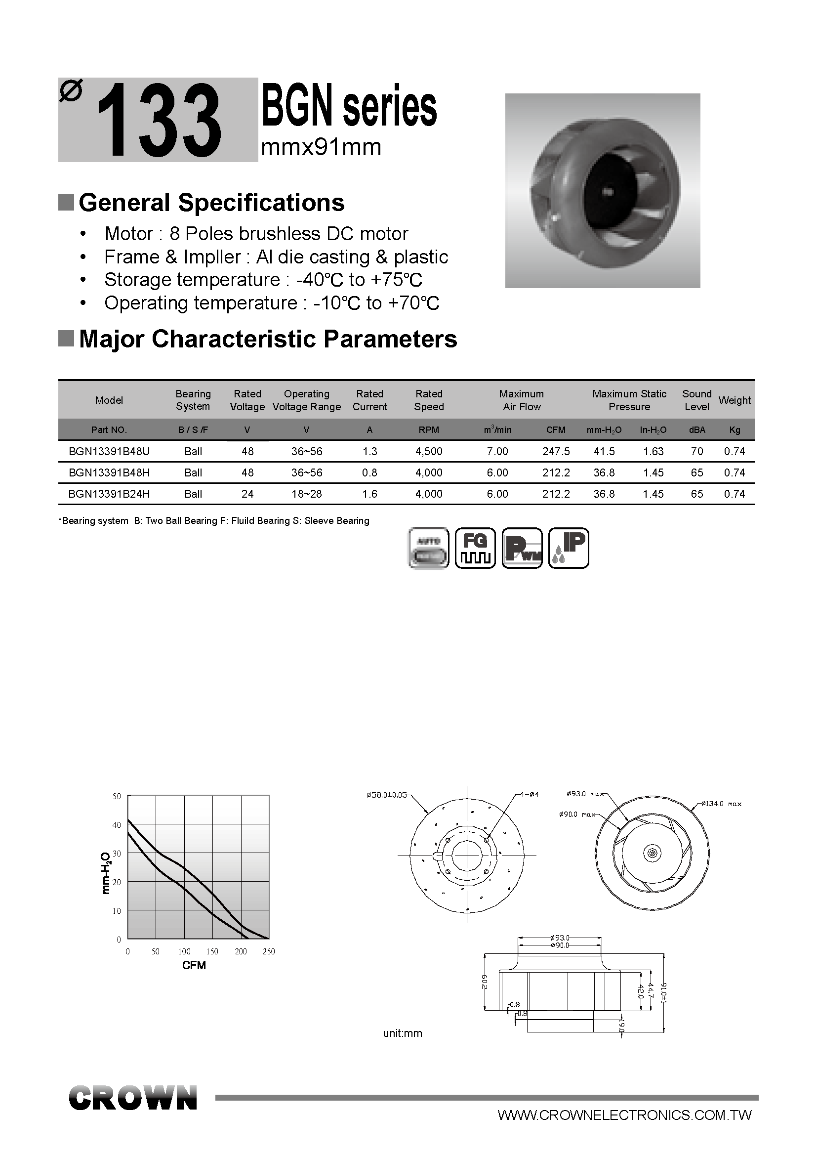 |  | ** = "WB" for wire lead type Ball bearing, or "TB" for terminal type Ball bearing 100, 200, 240V or special voltages 12, 24, 28, 38, 42, 48, 380~440~480... 50/60Hz, & dual voltage version available on request. Dual speed High/Medium 1/2, High/Low 1/3, Medium/Low 2/3, Low/extra Low 3/4 or triple speed 1/2/3 available on request. CROWN reserves the right to change data and improve electrical or mechanical design without notice, data tolerance +-10%
