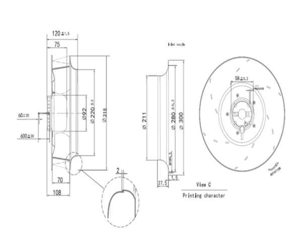 | 額定電壓 | 頻率 | 輸入功率 | 參考轉速 | 最大風量 | 最大風壓 | 噪音 | Model No | VAC | Range(V) | Current | RPM | CFM | m3/min | Inch/H2O | mm-H2O | db(A) | BGN280105B48U | 48 | 36~56 | 2.3 | 1700 | 990 | 28.04 | 1.59